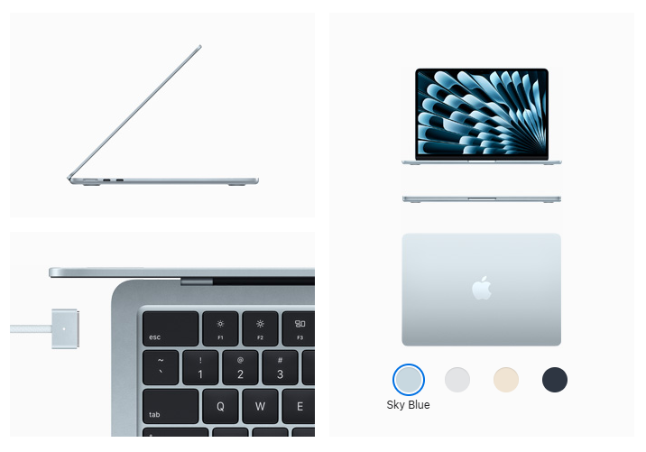 Now with Sky Blue, four beautiful colors will have you on cloud nine. And every MacBook Air comes with a color-matched MagSafe charging cable.