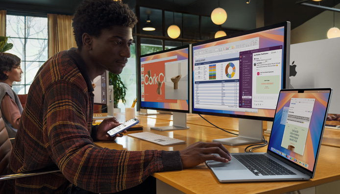 With tens of thousands of apps optimized for Apple silicon, all your favorites run lightning fast in macOS, including Microsoft 365 Copilot, Adobe Creative Cloud, and Google Workspace with Gemini. And regular, free macOS software updates keep things running smoothly.